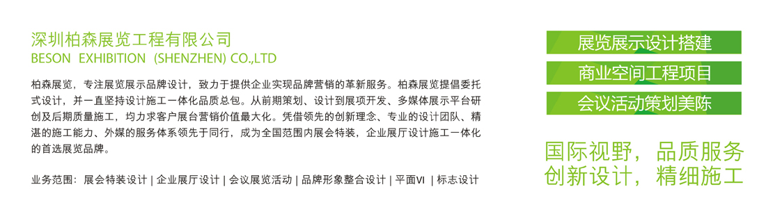 柏森展示:專注展覽展示品牌設計,提供深圳展臺搭建,深圳展臺設計,香港展臺搭建設計,是優(yōu)質(zhì)的深圳展覽工程公司。致力于提供企業(yè)實現(xiàn)品牌營銷的革新服務。柏森展示提倡委托式設計,并一直堅持展臺設計施工一體化品質(zhì)總包。從前期展覽策劃、設計到展項開發(fā)、多媒體展示平臺研創(chuàng)及后期質(zhì)量施工,均力求客戶展臺營銷價值最大化。憑借領先的創(chuàng)新理念、專業(yè)的設計團隊、精湛的施工能力、外媒的服務體系領先于同行,成為全國范圍內(nèi)展會特裝,企業(yè)展廳設計施工一體化的首選展覽品牌公司。